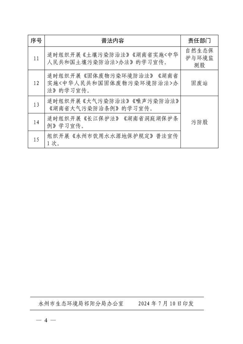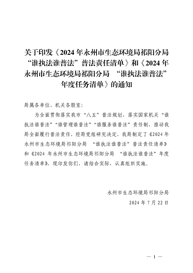关于印发《2024年永州市生态环境局祁阳分局“谁执法谁普法”普法责任清单》和《2024年永州市生态环境局祁阳分局“谁执法谁普法”年度任务清单》的通知