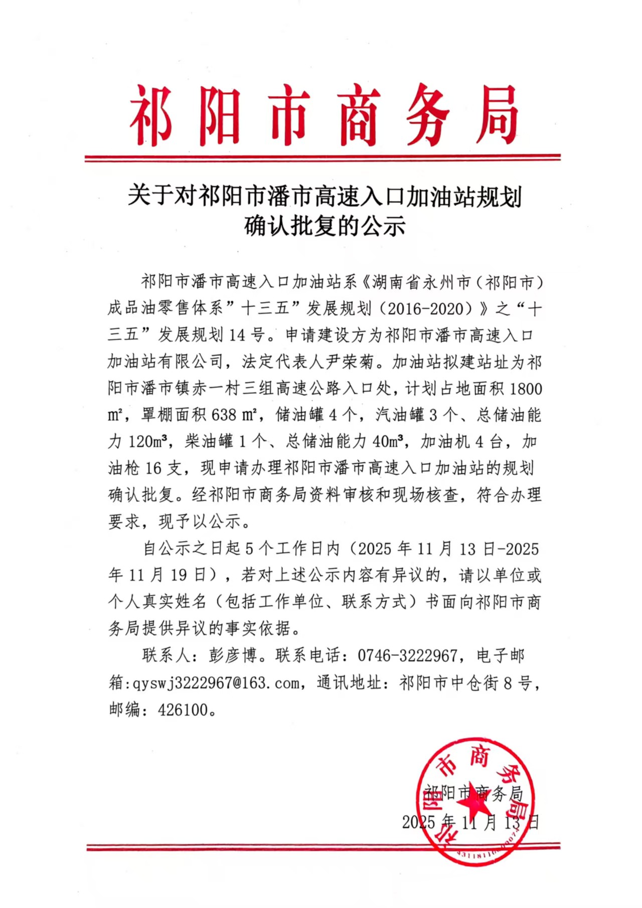 关于对祁阳市潘市高速入口加油站规划确认批复的公示
