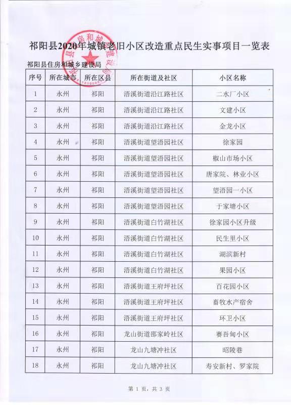 祁阳县2020年城镇老旧小区改造重点民生实事项目一览表