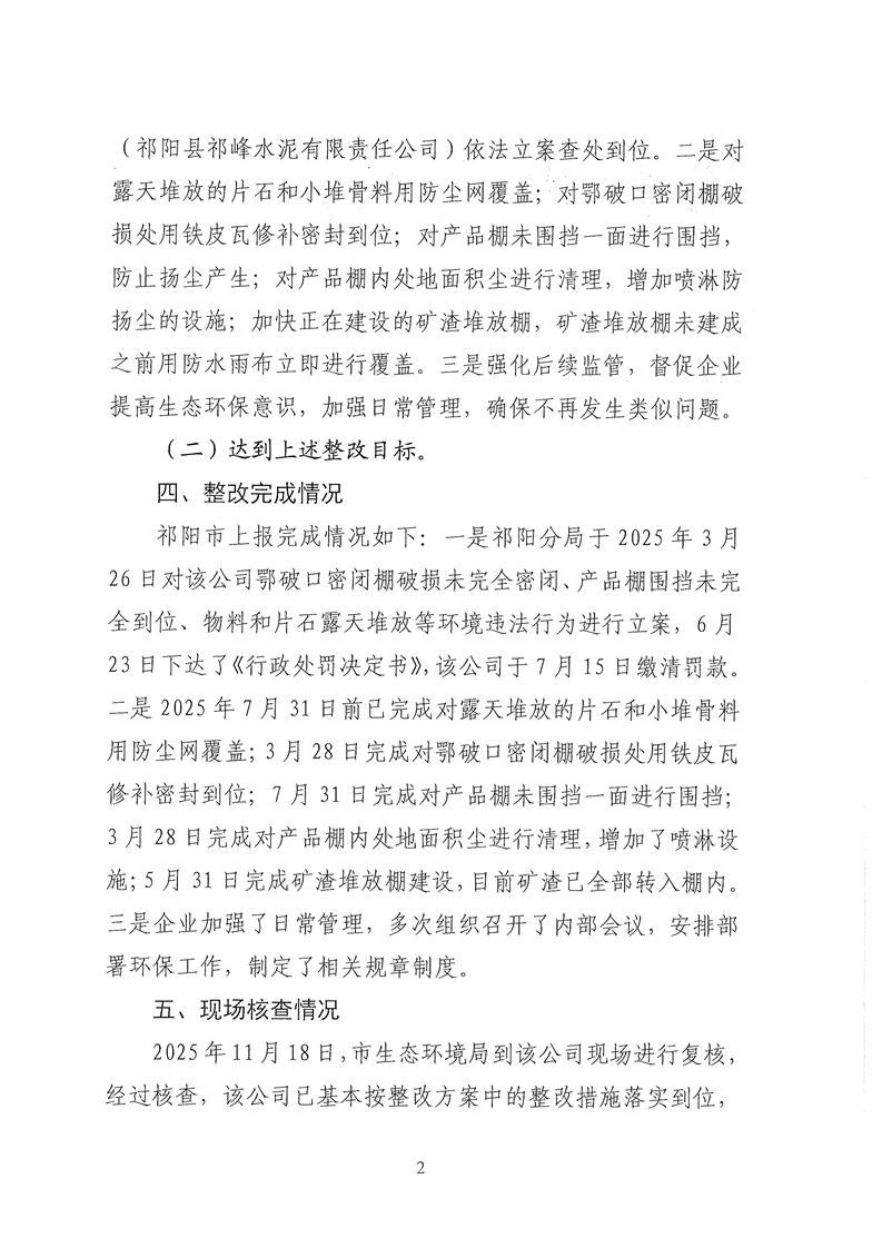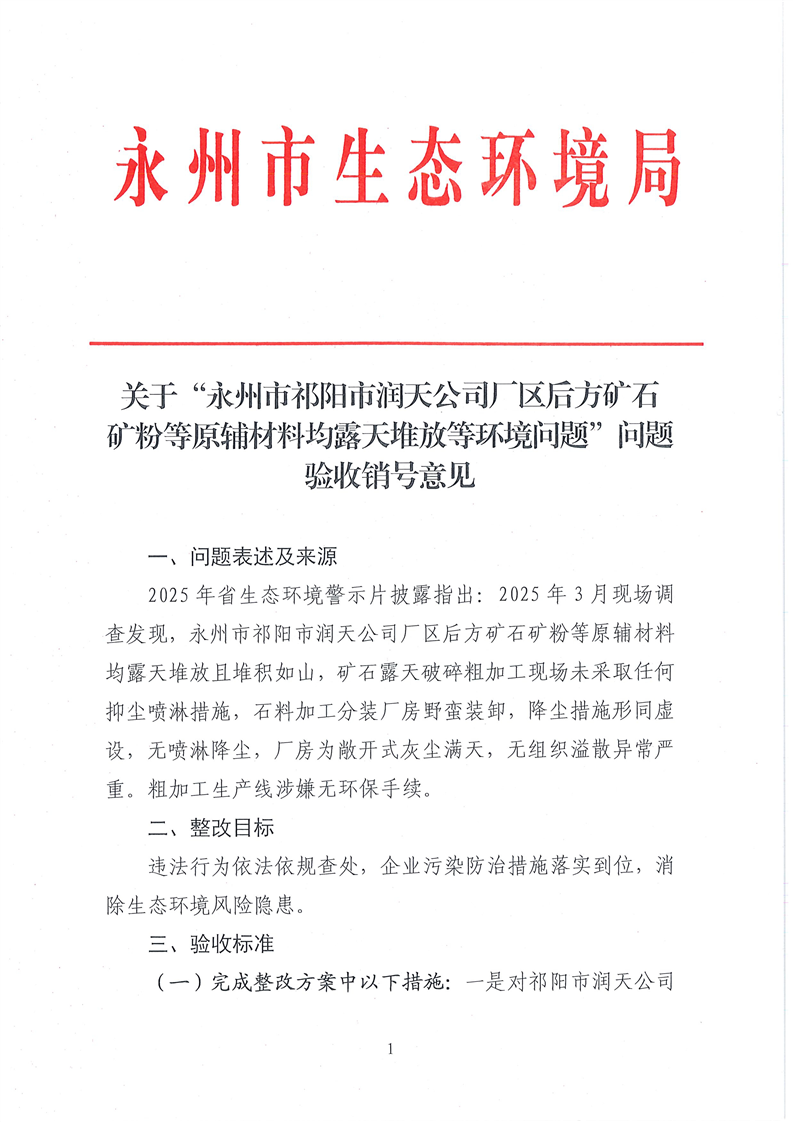 关于“永州市祁阳市润天公司厂区后方矿石矿粉等原辅材料均露天堆放等环境问题”问题验收销号意见