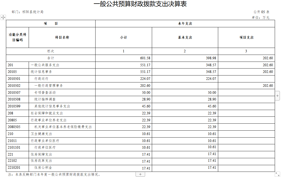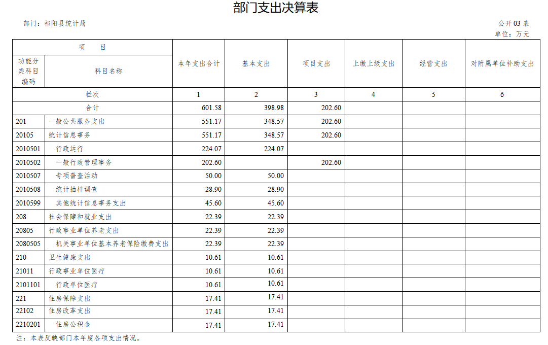 1、一般公共服务支出(201)统计信息事务(20105)行政运行(2010501)、一般行政管理事务(2010502)、专项普查活动(2010507)、统计抽样调查(2010508)、其他统计信息事务支出(2010599)。