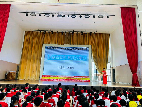 为普及科学的青春期知识,引导青少年正确认识青春期,了解青春期生理、心理的变化,缓解青春期焦虑情绪和青春期变化带来的压力,提升学生防范性侵害的自我保护意识和能力,保持积极向上的生活态度,快乐地度过青春期。2024年6月13日下午,向阳学校特邀请湖南省蒋丽君心理健康教育名师工作室蒋丽君老师来校,为高年级学生开展了以“解密青春期,知我少年心”为主题的青春期知识讲座。