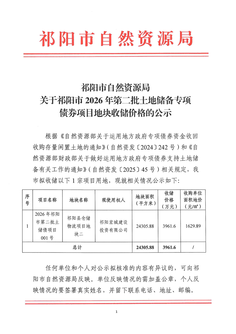 关于祁阳市2026年第二批土地储备专项债券项目地块收储价格的公示