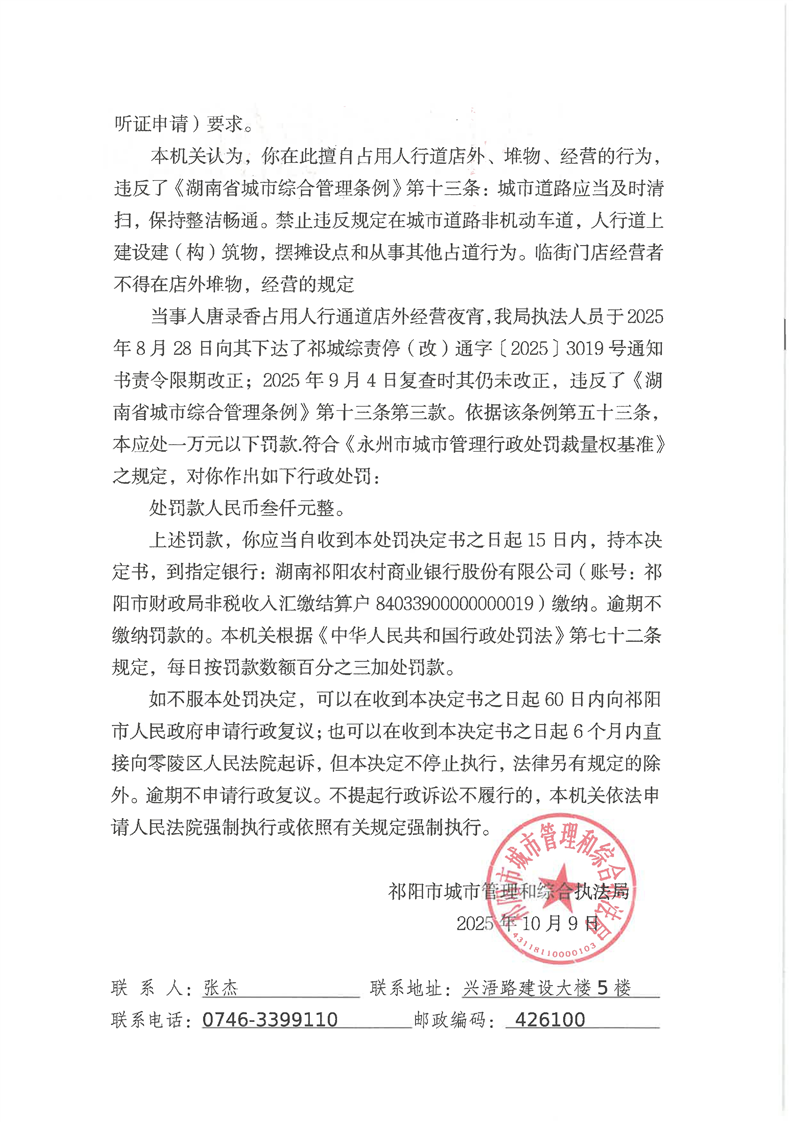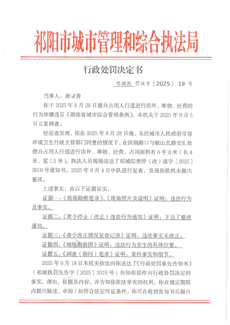 祁阳市城市管理和综合执法局行政处罚决定书 祁城执罚决字(2025) 19号