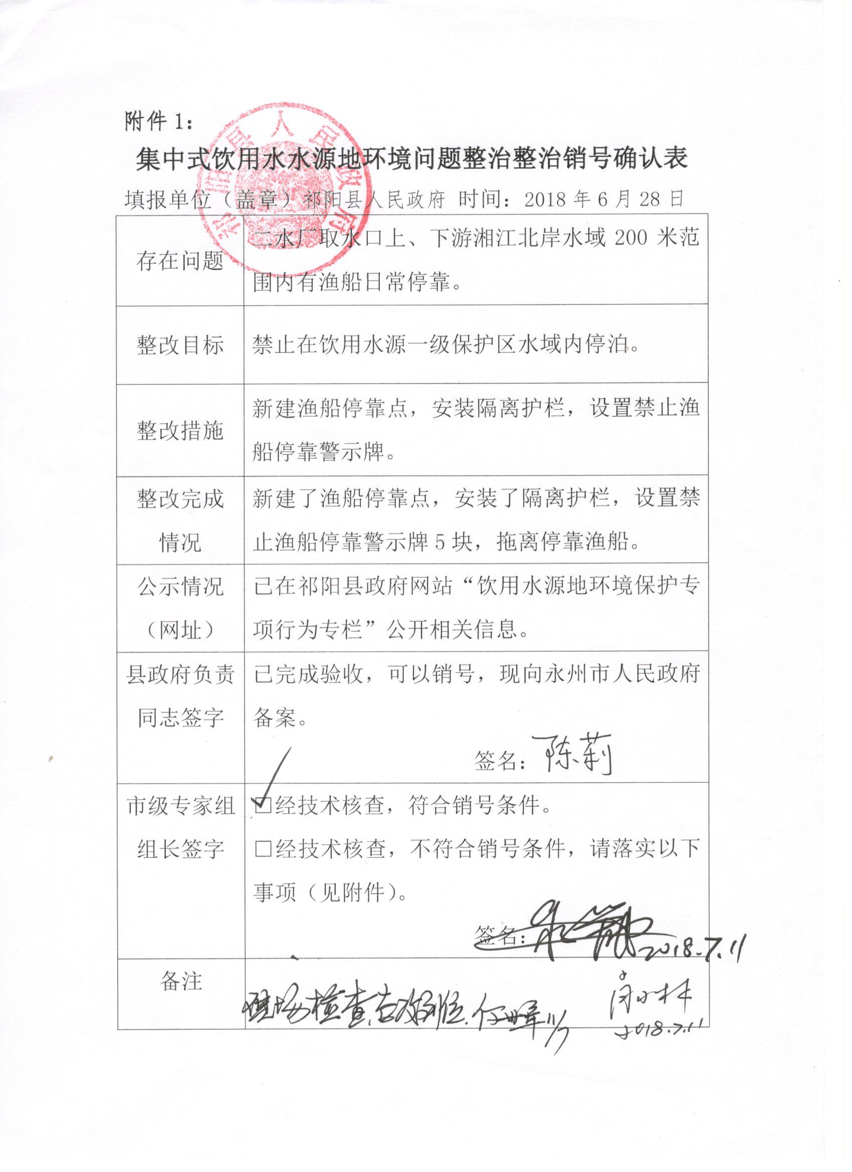 二水厂上下游200米处渔船停靠销号确认单