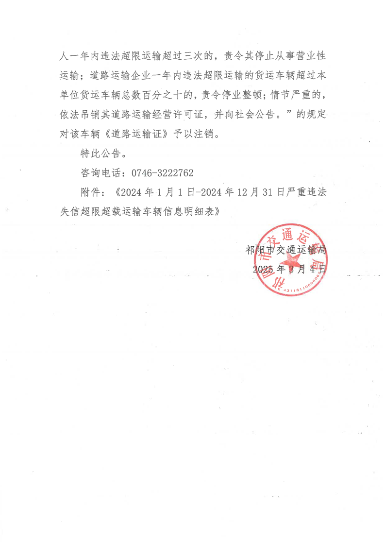 关于拟注销超限超载达三次以上的货运车辆《道路运输证》的公告