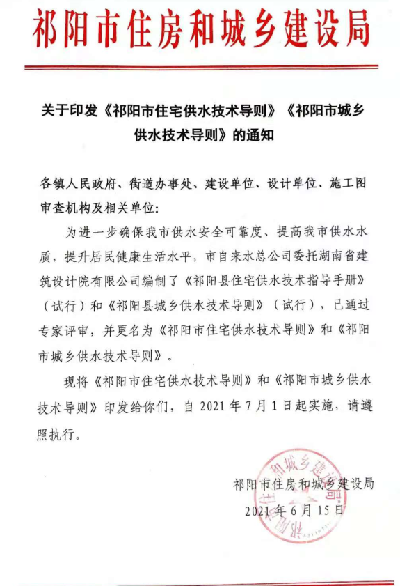 关于印发《祁阳市住宅供水技术导则》《祁阳市城乡供水技术导则》的通知
