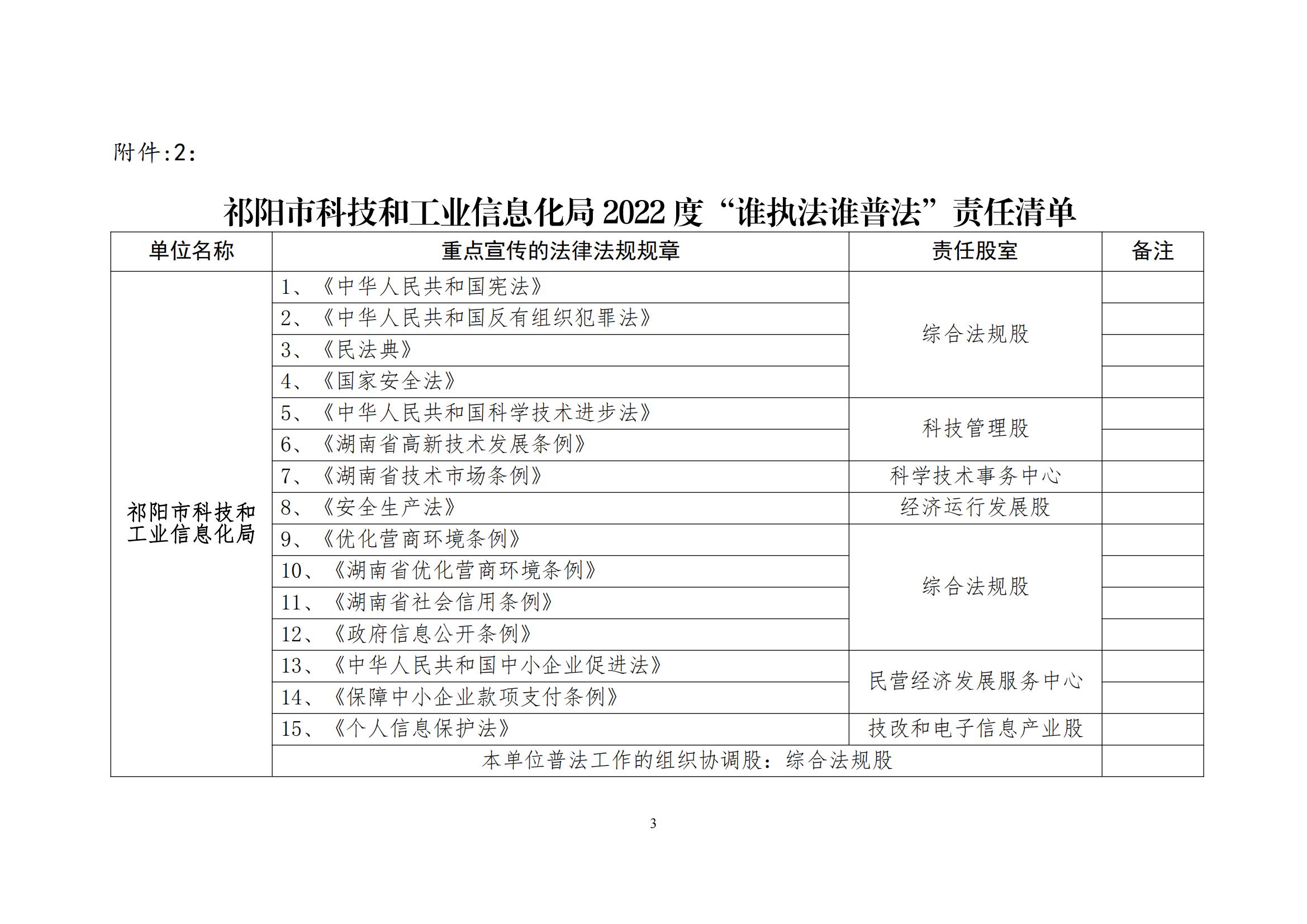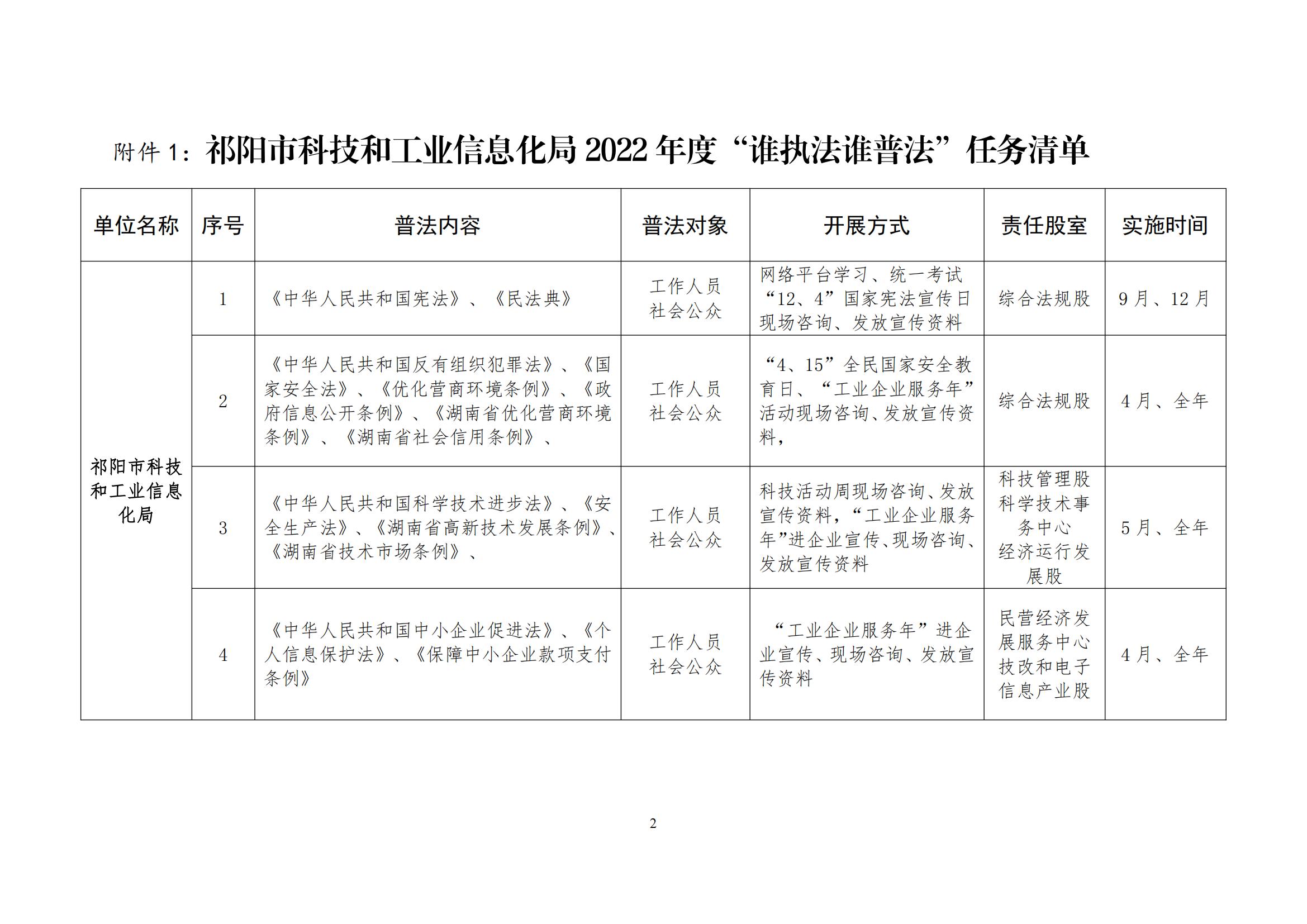 祁阳市科技和工业信息化局关于印发《祁阳市科技和工业信息化局2022年度“谁执法谁普法”普法任务清单和责任清单》的通知