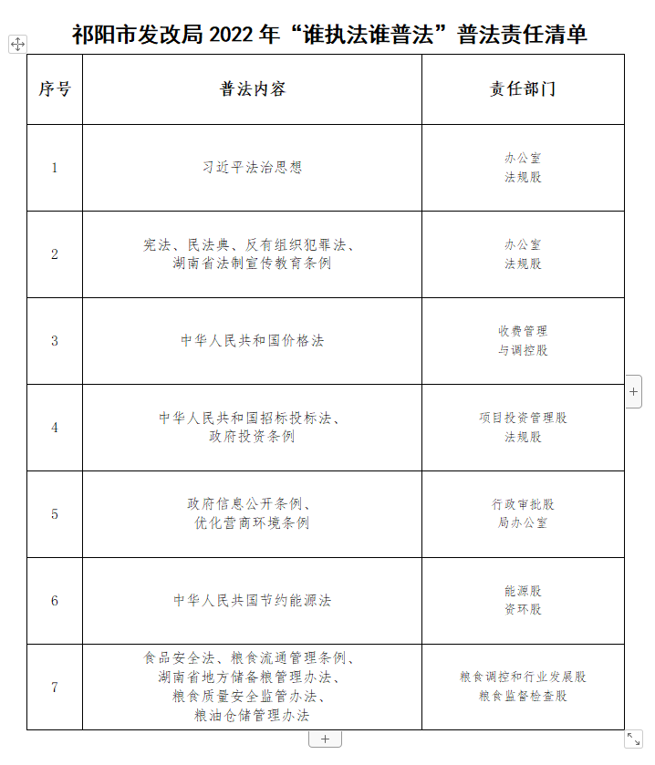 为全面贯彻落实我市“八五”普法规划,推动我局普法工作顺利开展,经局党组研究决定,制定了《祁阳市发改局2022年“谁执法谁普法”普法任务清单和责任清单》,现印发给你们,请结合实际,认真组织实施。