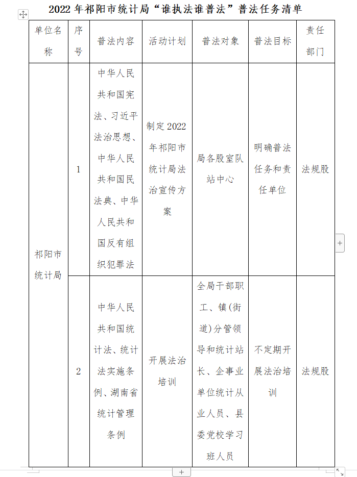 为全面贯彻落实中共祁阳市委全面依法治市委员会2022年法治工作要点,推动我局全面履行普法责任,经局党组研究决定,我局制定了《祁阳市统计局2022“谁执法谁普法”普法任务清单和责任清单》,现印发给你们,请结合实际,认真组织实施。