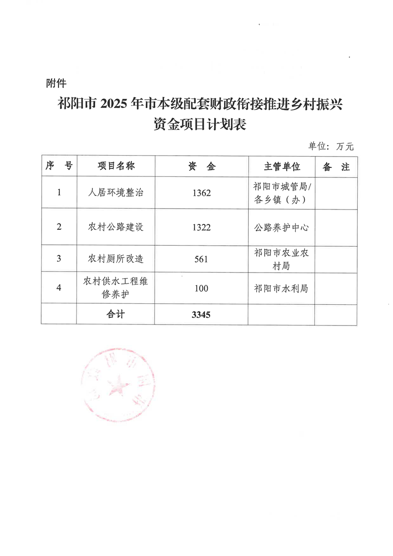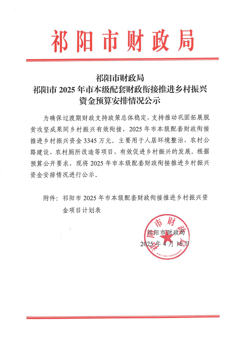 祁阳市2025年市本级配套财政衔接推进乡村振兴资金预算安排情况公示