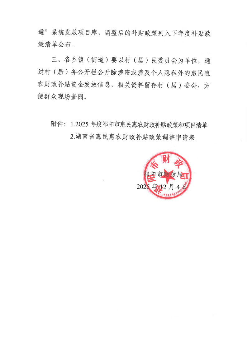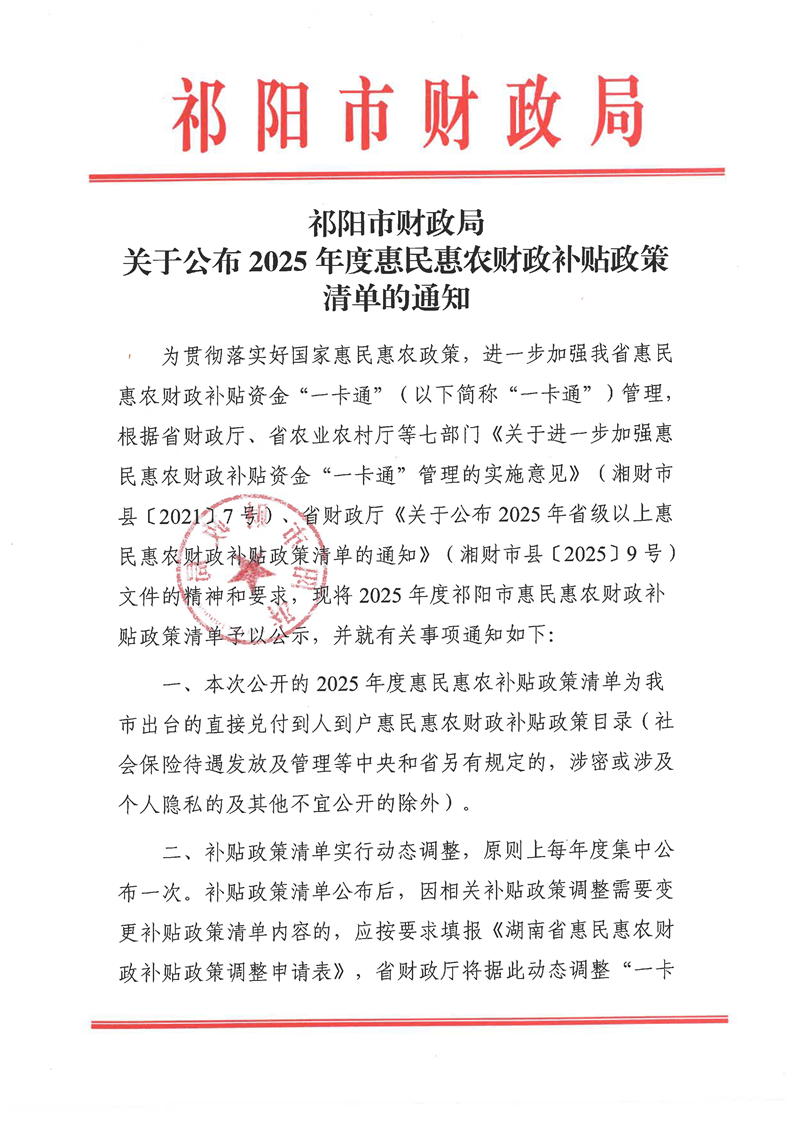 祁阳市财政局关于公布2025年度惠民惠农财政补贴政策清单的通知