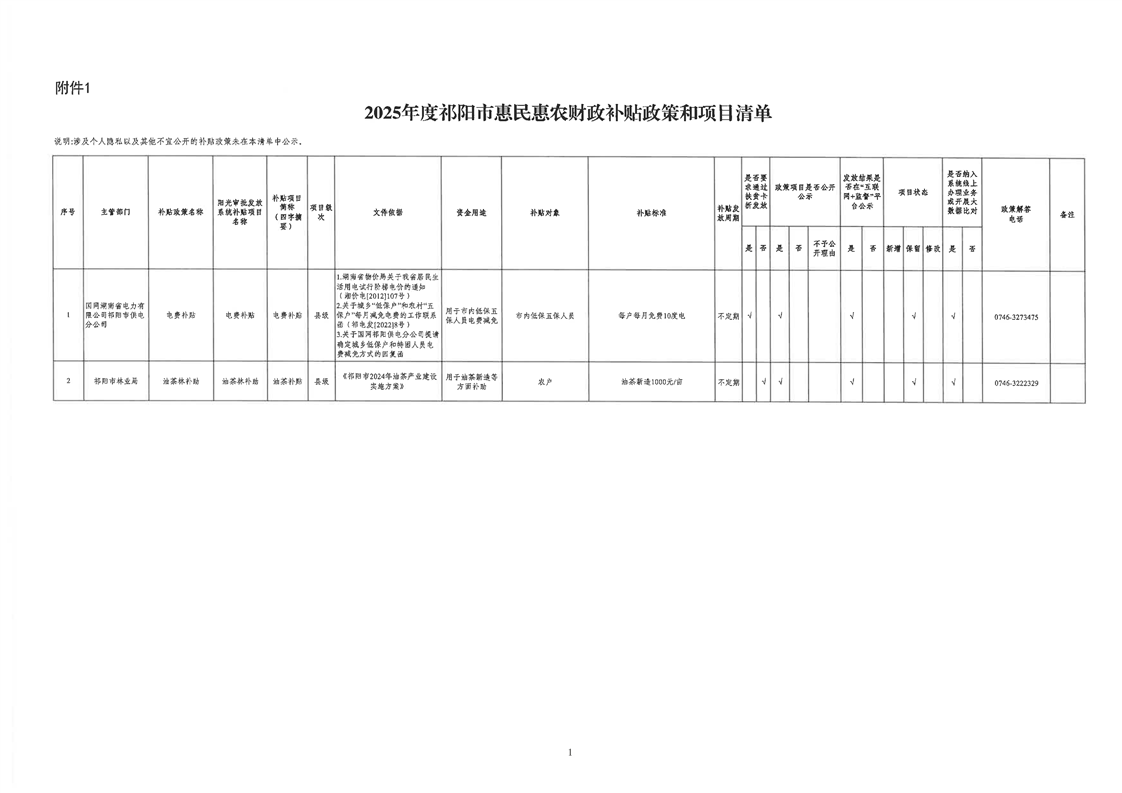 附件1:2025年度祁阳市惠民惠农财政补贴政策和项目清单