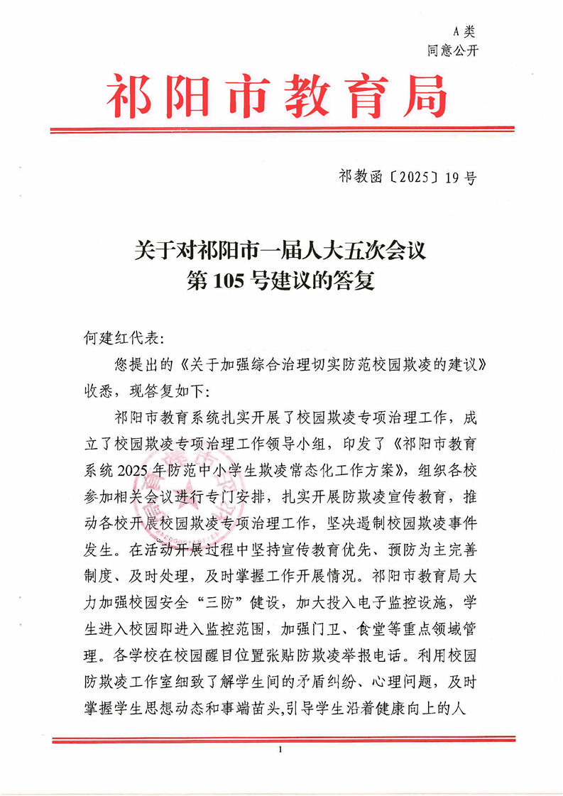 祁教函[2025]19号 关于对祁阳市一届人大五次会议第105号建议的答复