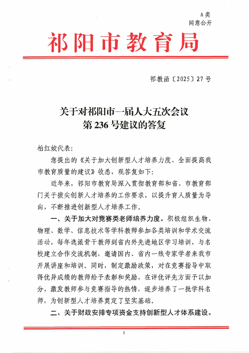 祁教函[2025]27号 关于对祁阳市一届人大五次会议第236号建议的答复