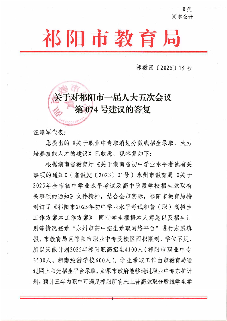 祁教函[2025]15号 关于对祁阳市一届人大五次会议第074号建议的答复
