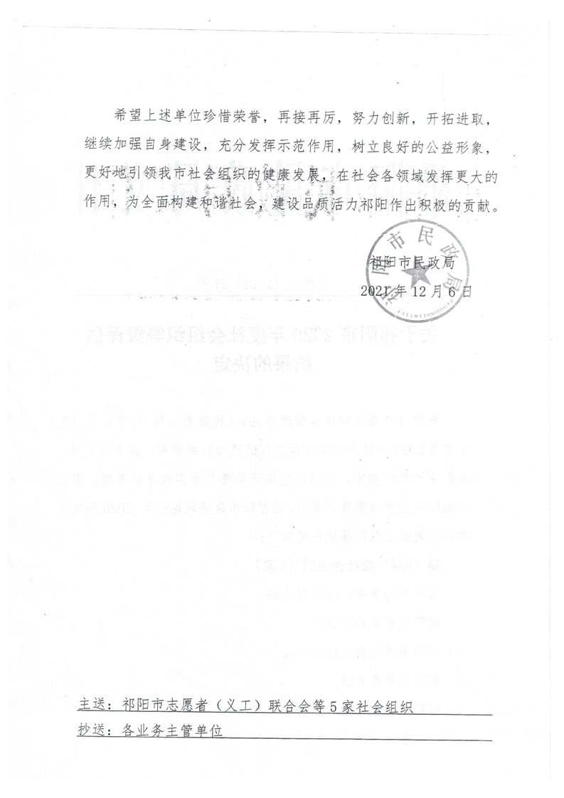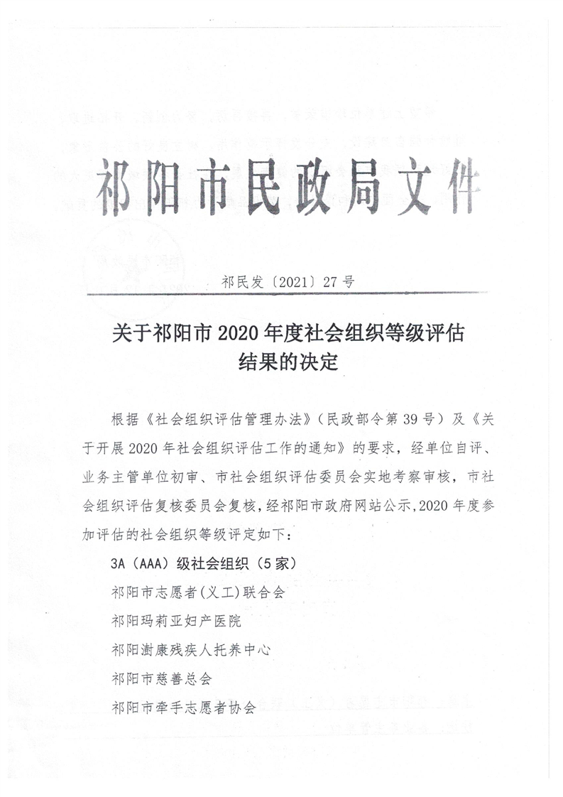 关于祁阳市2020年度社会组织登级评估结果的决定