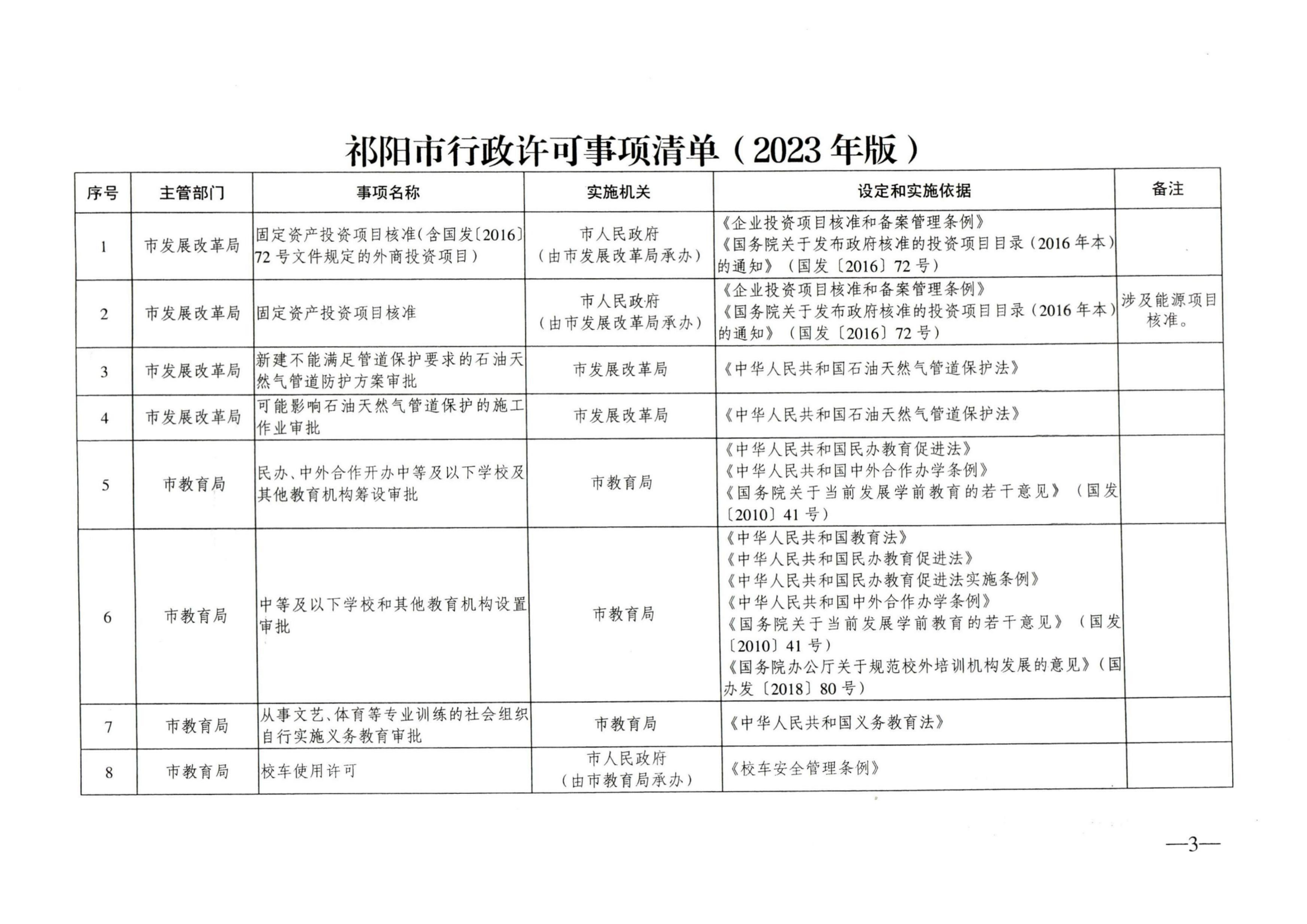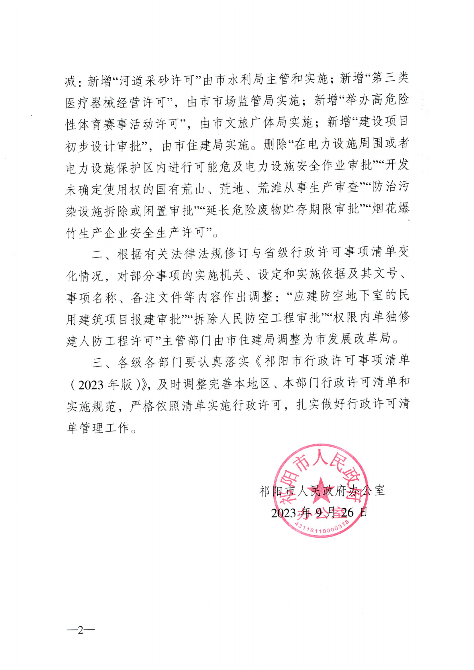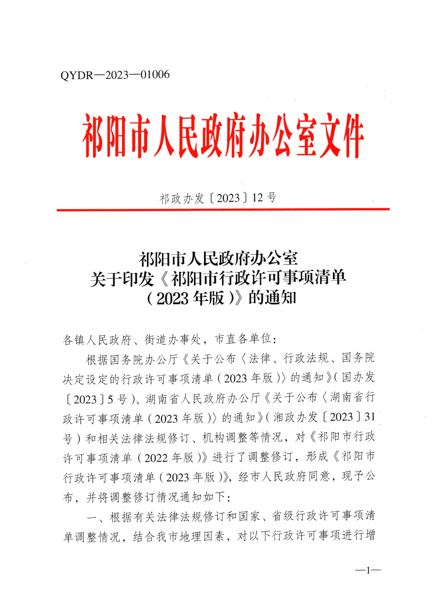 祁阳市人民政府办公室关于印发《祁阳市行政许可事项清单(2023年版)》的通知