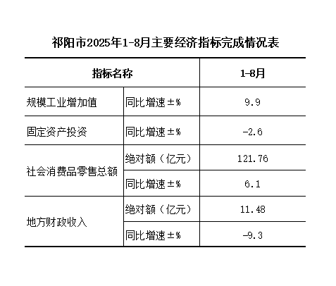 祁阳市2025年1-8月主要经济指标完成情况表