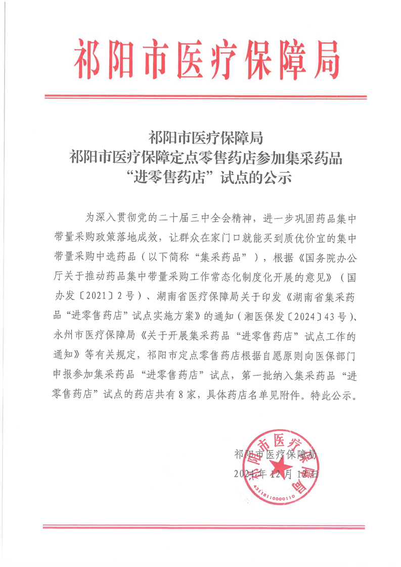 祁阳市医疗保障定点零售药店参加集采药品“进零售药店”试点的公示