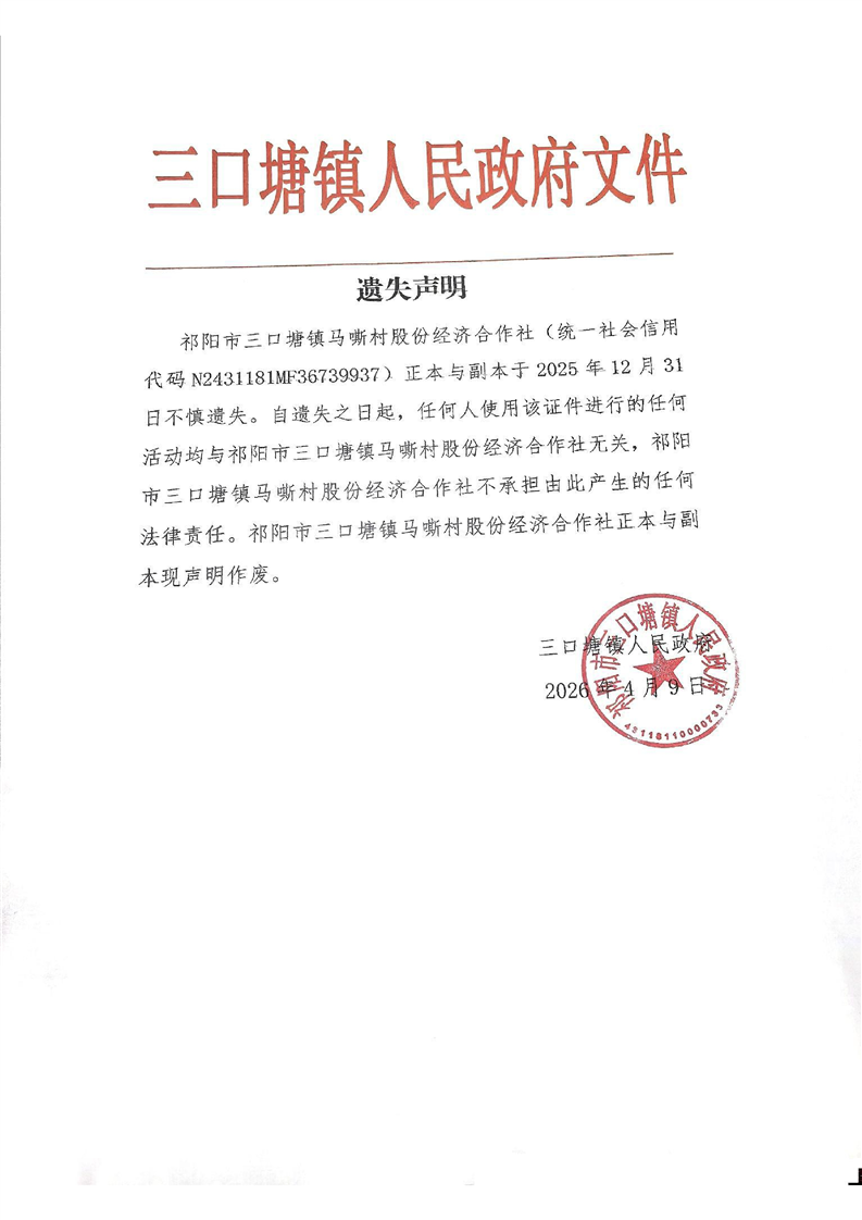 遗失声明(祁阳市三口塘镇马嘶村股份经济合作社)