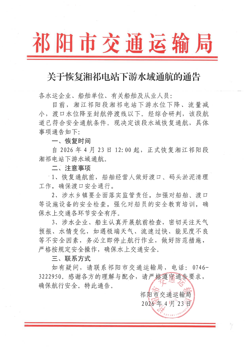 关于恢复湘祁电站下游水域通航的通告
