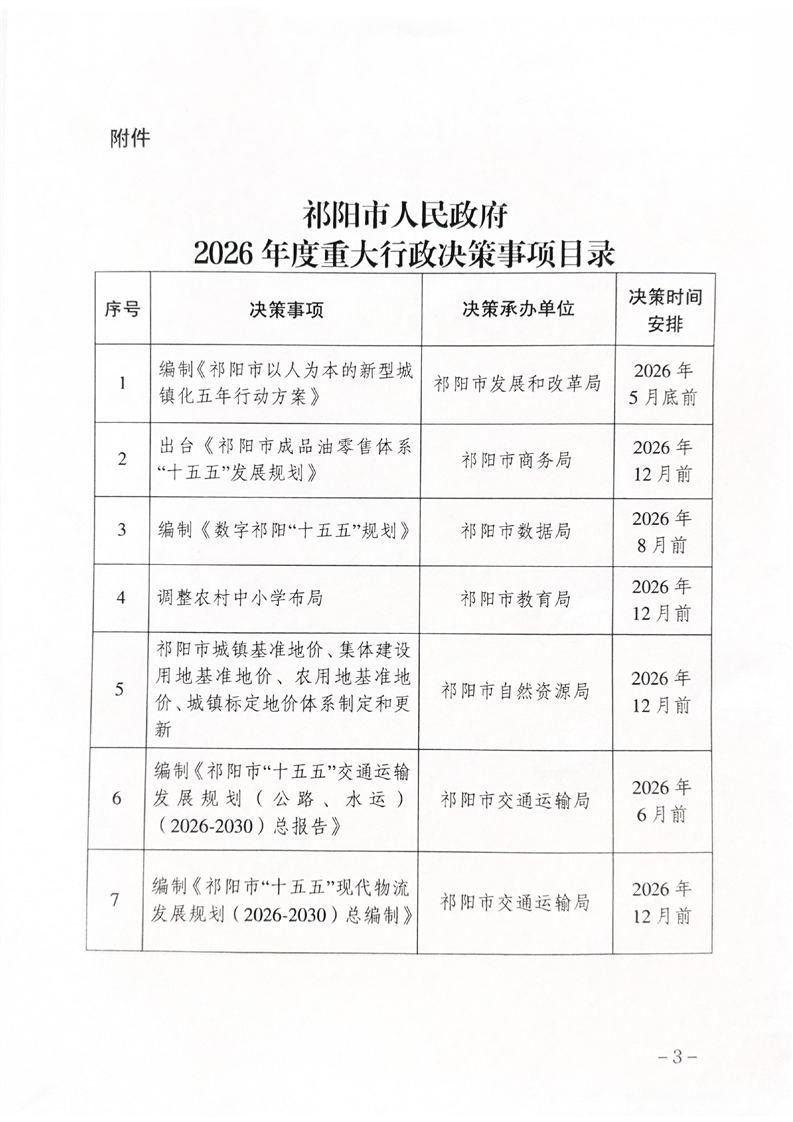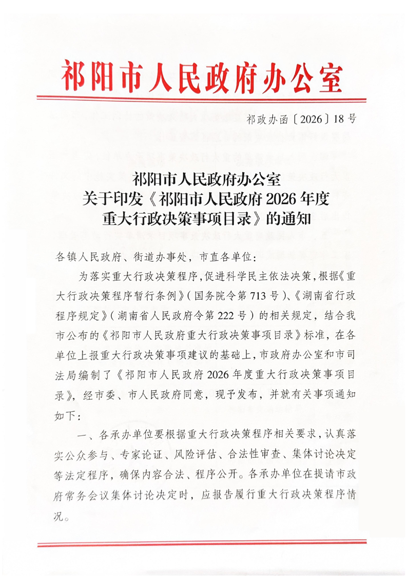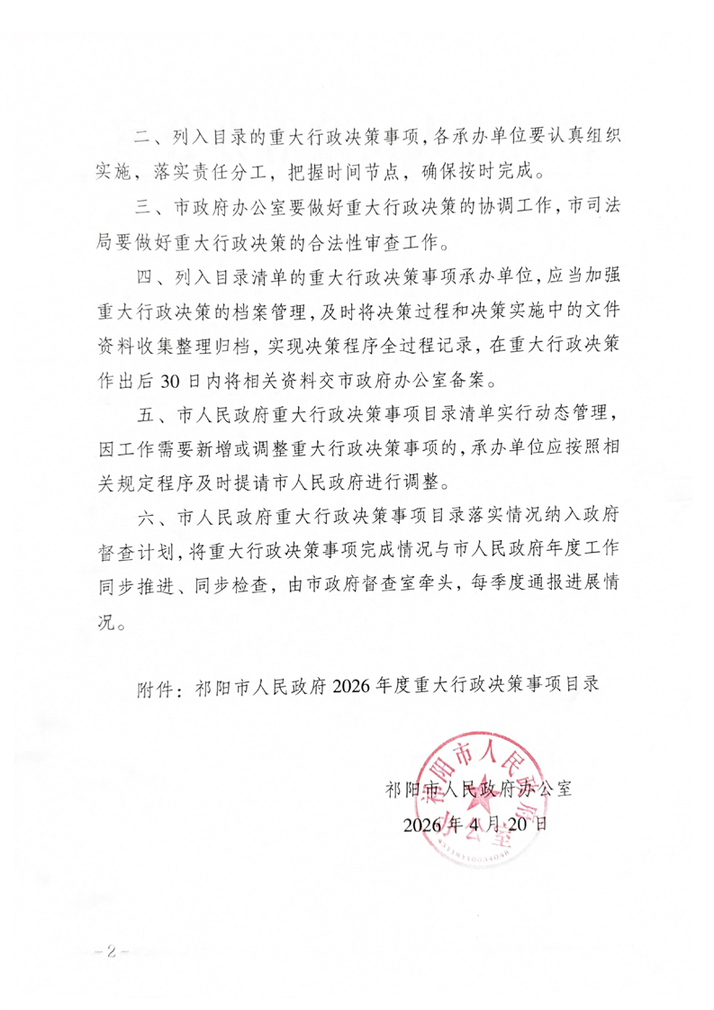 关于印发《祁阳市人民政府2026年度重大行政决策事项目录》的通知
