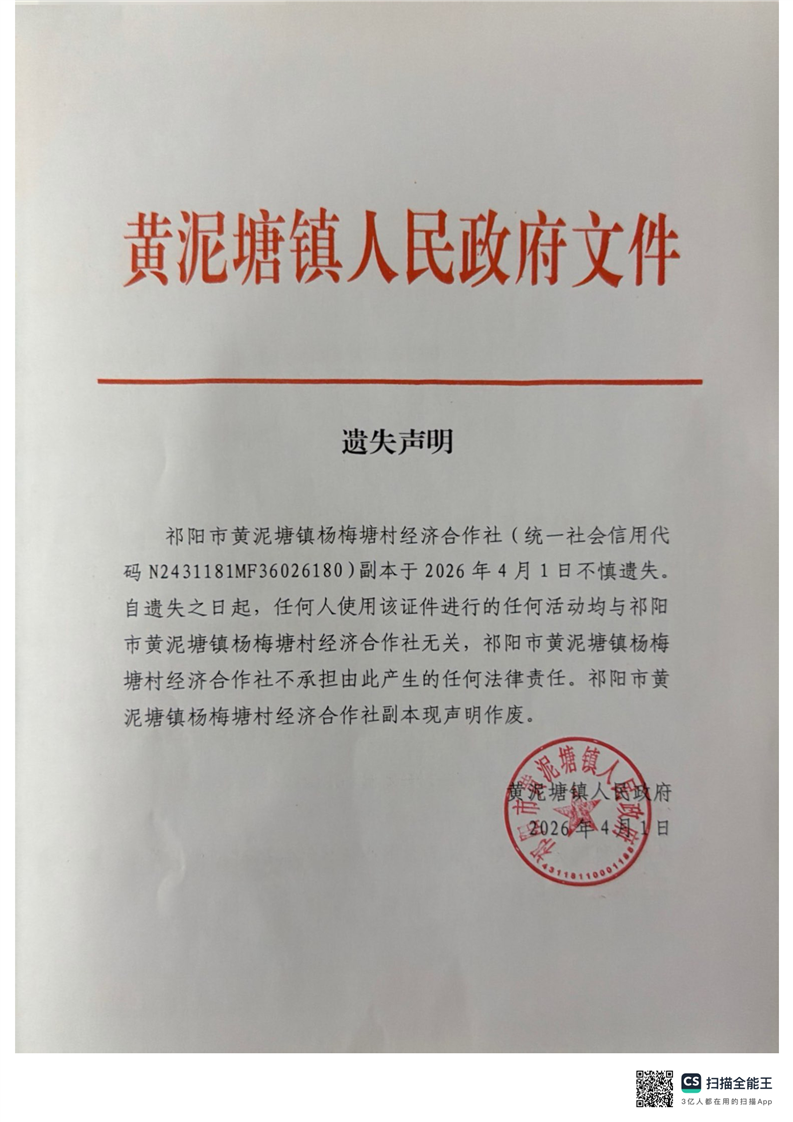 遗失声明(祁阳市黄泥塘镇杨梅塘村经济合作社)