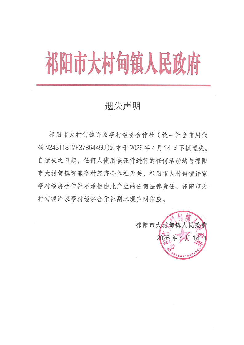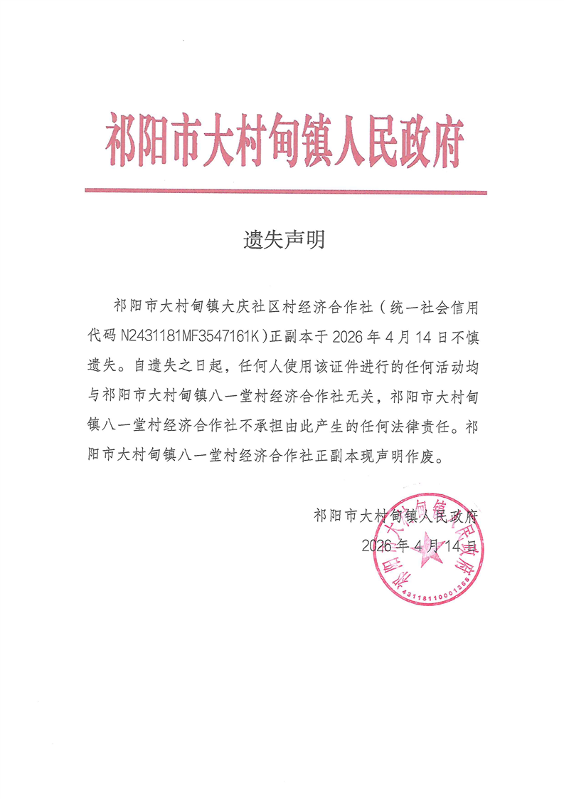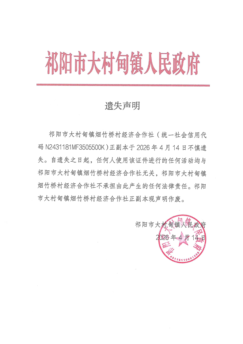 遗失声明(祁阳市大村甸镇烟竹桥村经济合作社)