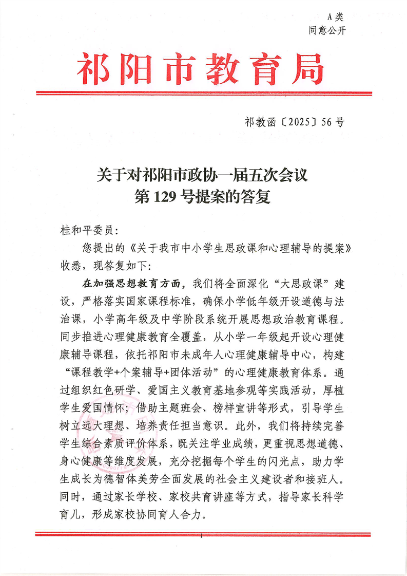 祁教函[2025]56号 关于对祁阳市政协一届五次会议第129号提案的答复