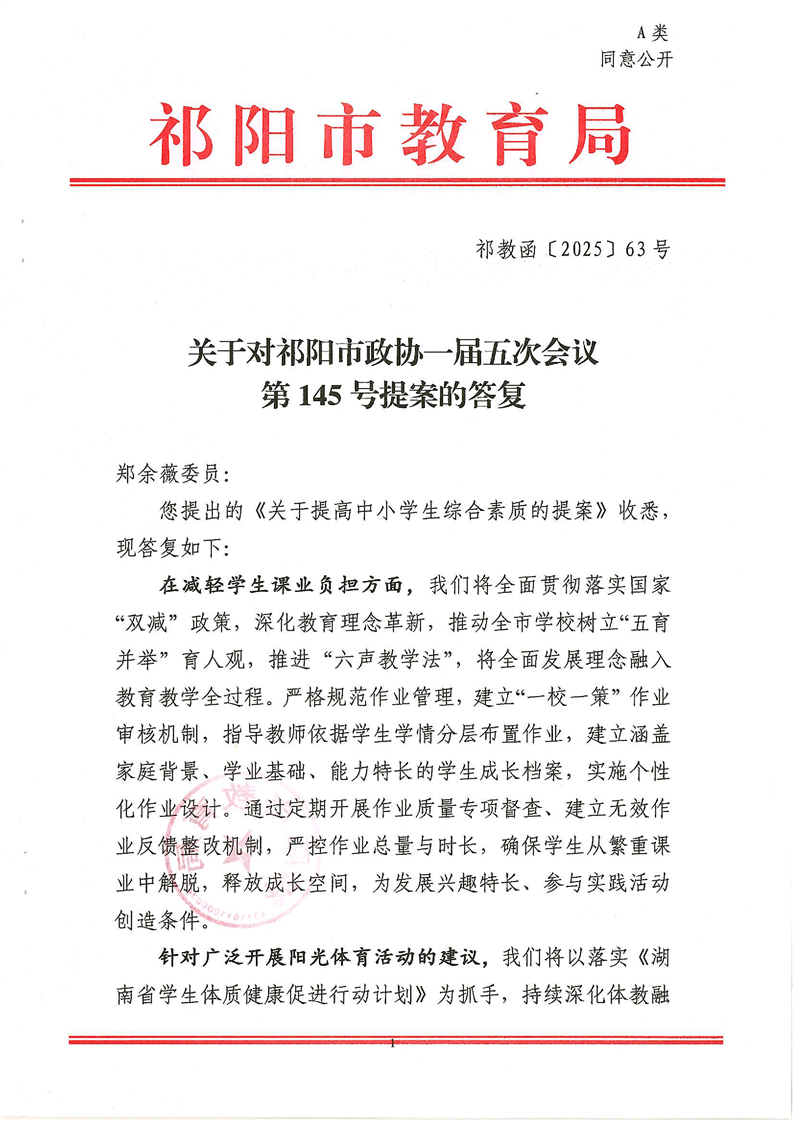 祁教函[2025]63号 关于对祁阳市政协一届五次会议第145号提案的答复