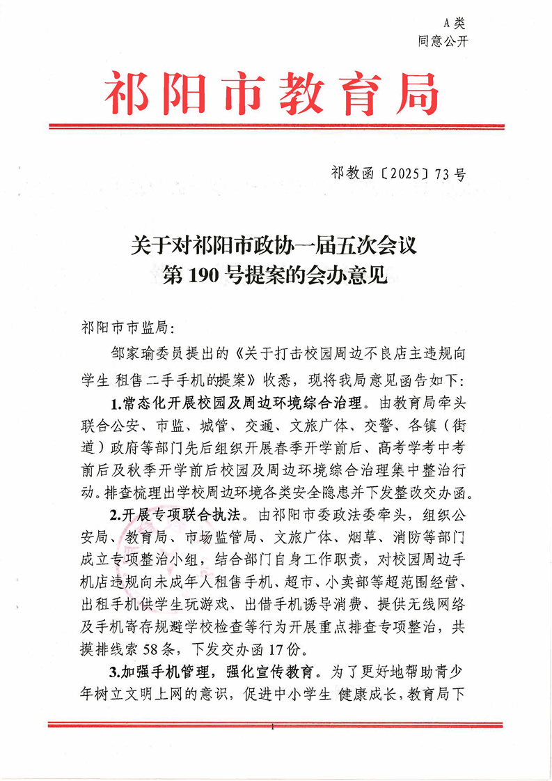 祁教函[2025]73号 关于对祁阳市政协一届五次会议第190号提案的会办意见