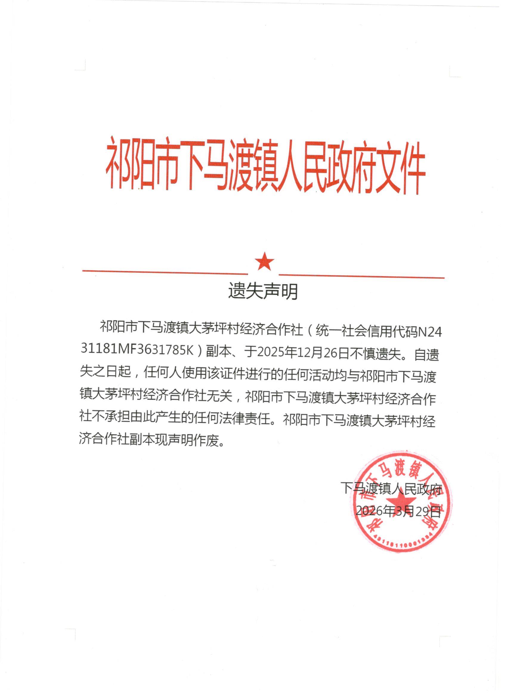 遗失声明(祁阳市下马渡镇大茅坪村)