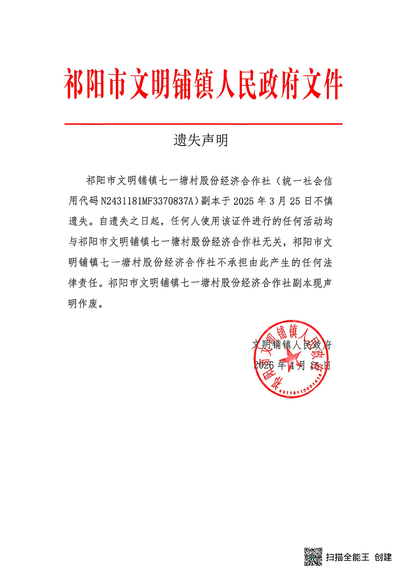 遗失声明(祁阳市文明铺镇七一塘村股份经济合作社)