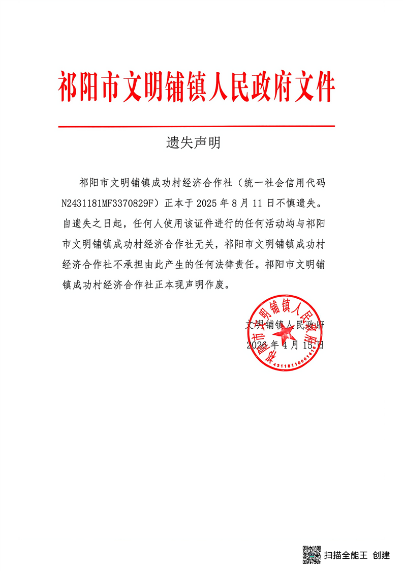 遗失声明(祁阳市文明铺镇成功村经济合作社)