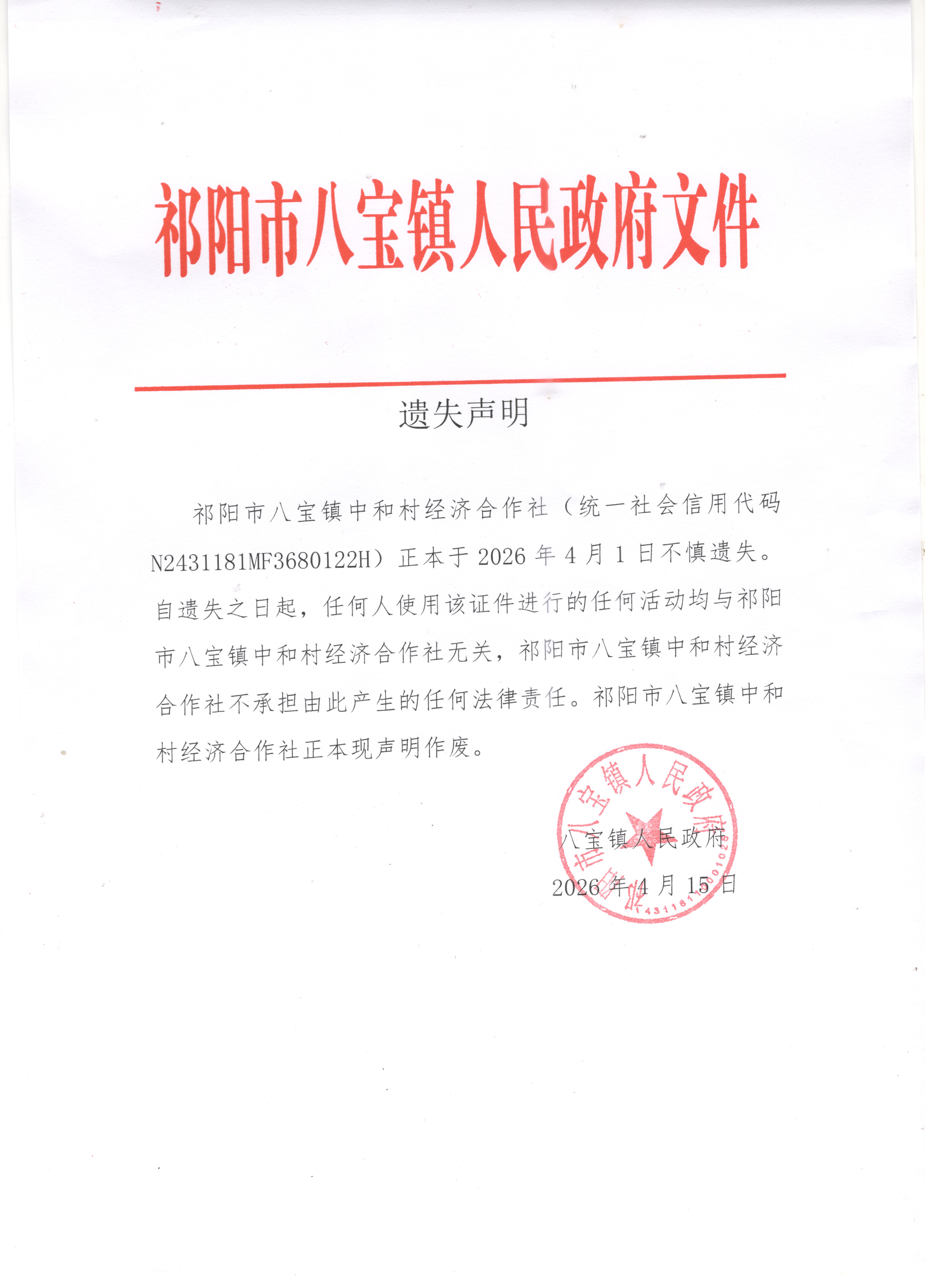 遗失声明(祁阳市八宝镇中和村)