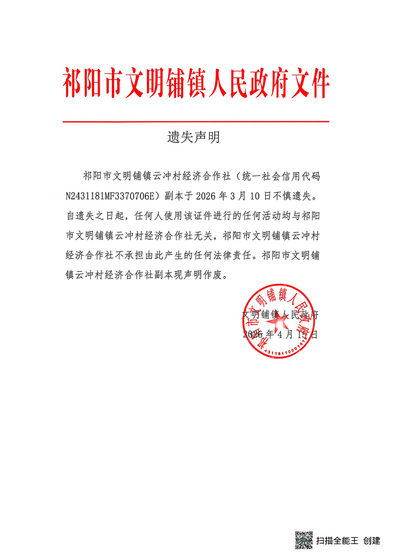 遗失声明(祁阳市文明铺镇云冲村经济合作社)