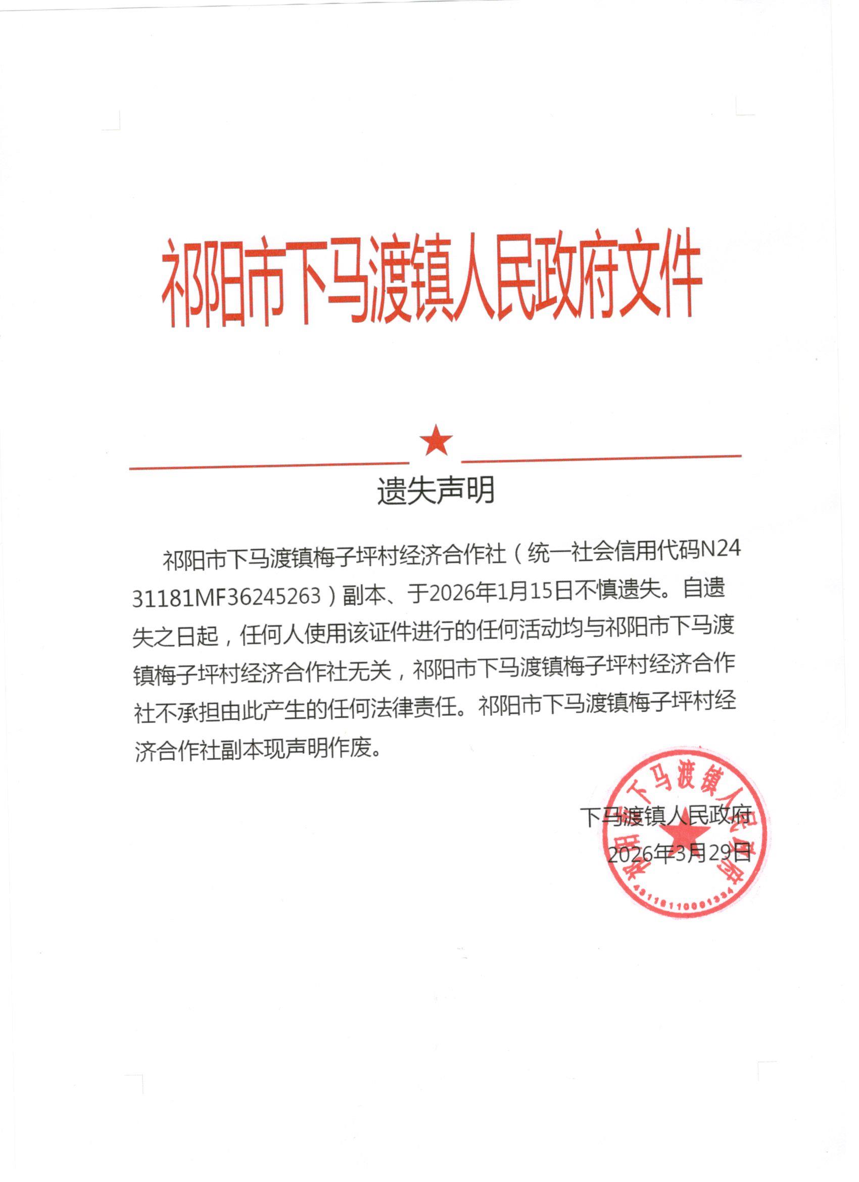 遗失声明(祁阳市下马渡镇梅子坪村)