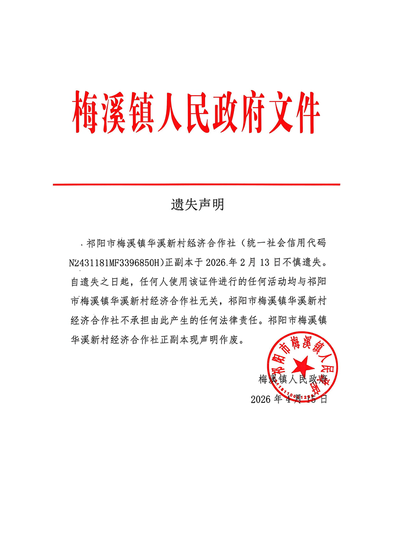 遗失声明(祁阳市梅溪镇华溪新村经济合作社)