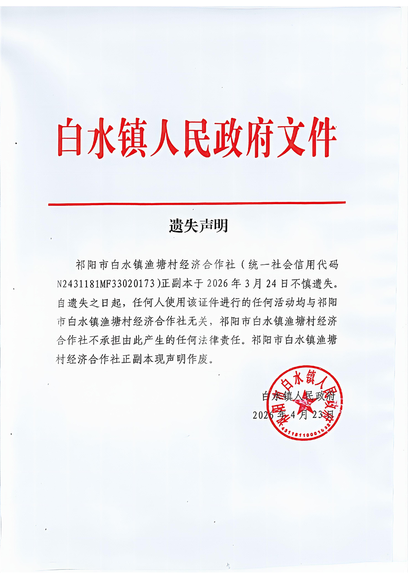 遗失声明(祁阳市白水镇渔塘村)