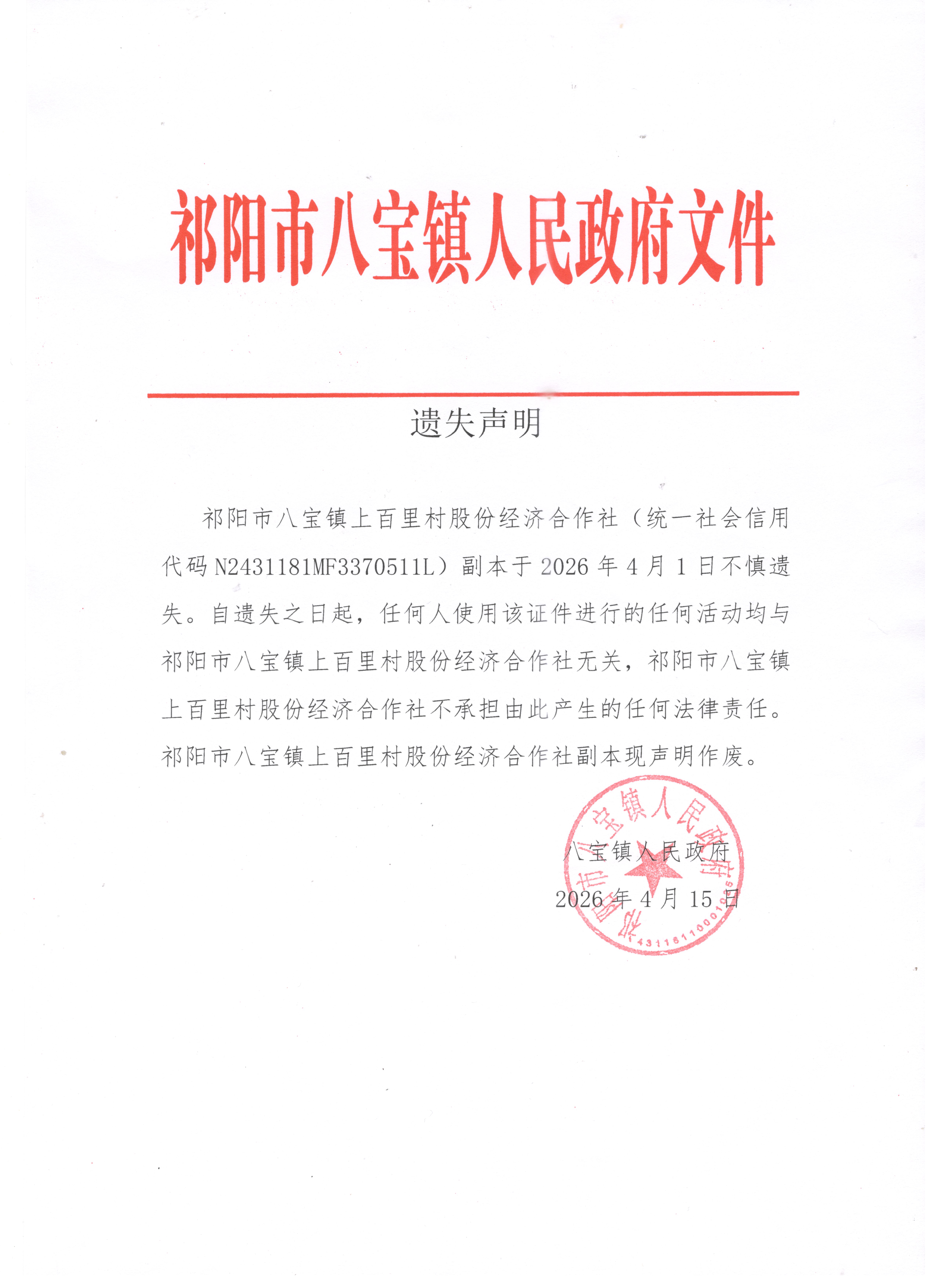 遗失声明(祁阳市八宝镇上百里村)
