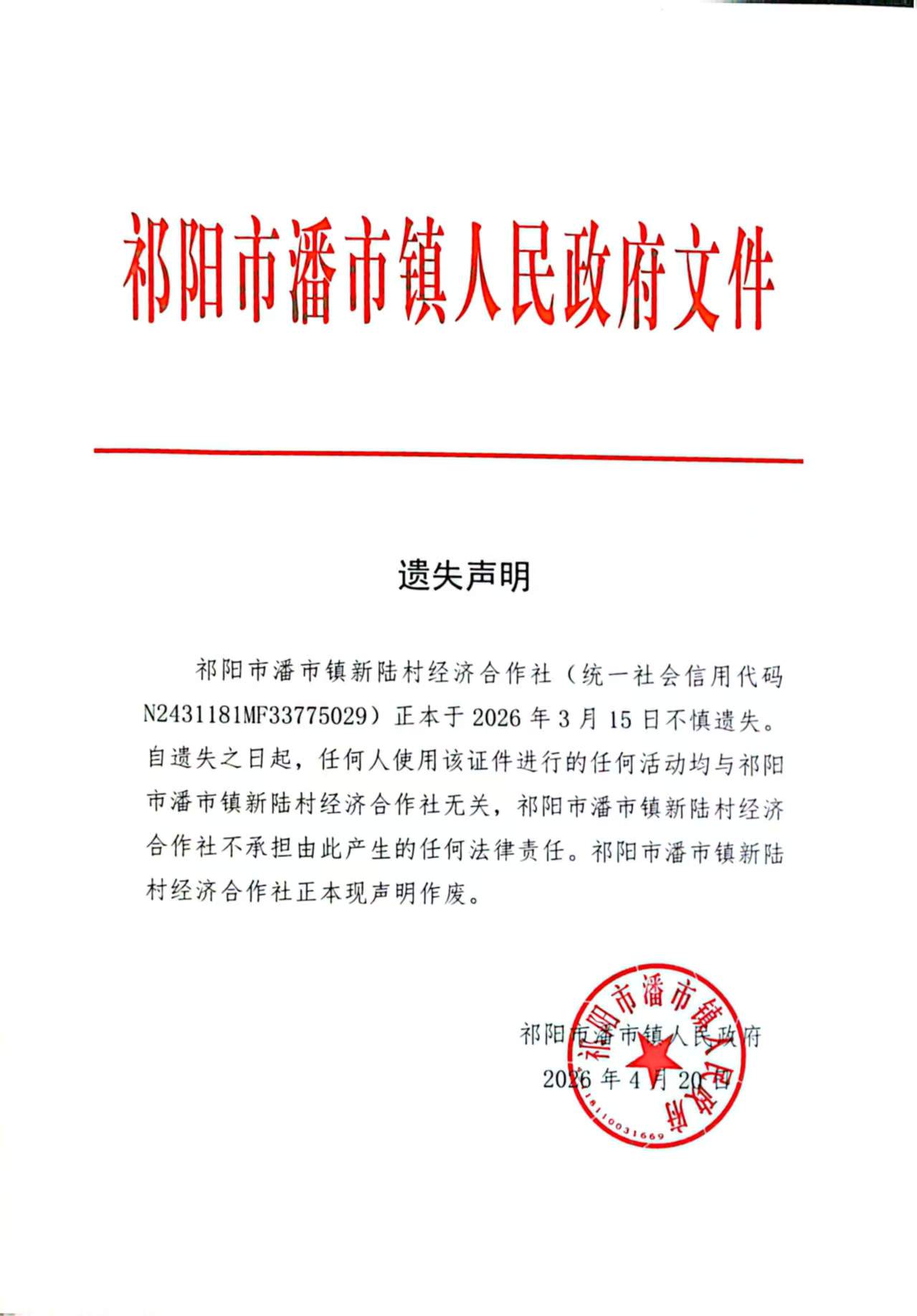 遗失声明(祁阳市潘市镇新陆村)