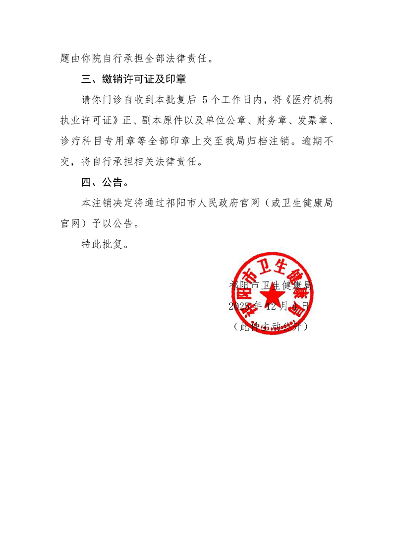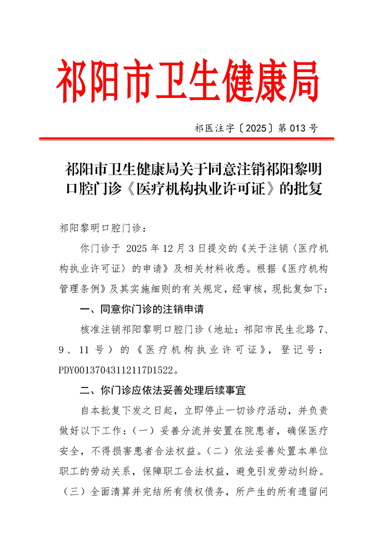 祁阳市卫生健康局关于同意注销祁阳黎明口腔门诊《医疗机构执业许可证》的批复