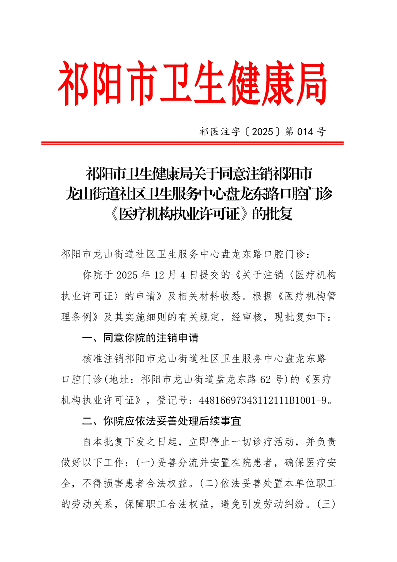 关于同意注销祁阳市龙山街道社区卫生服务中心盘龙东路口腔门诊《医疗机构执业许可证》的批复