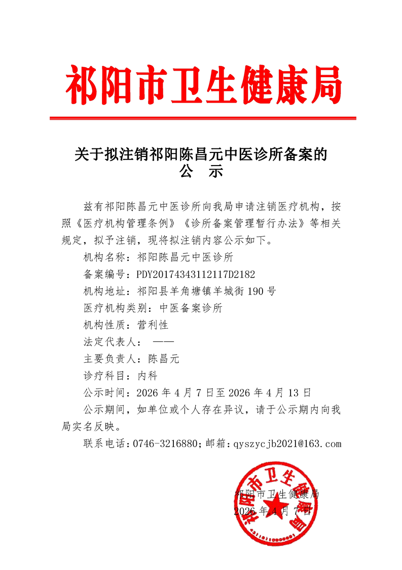 关于拟注销祁阳陈昌元中医诊所备案的公示