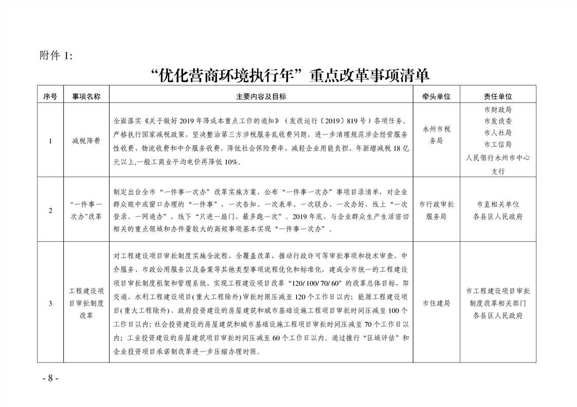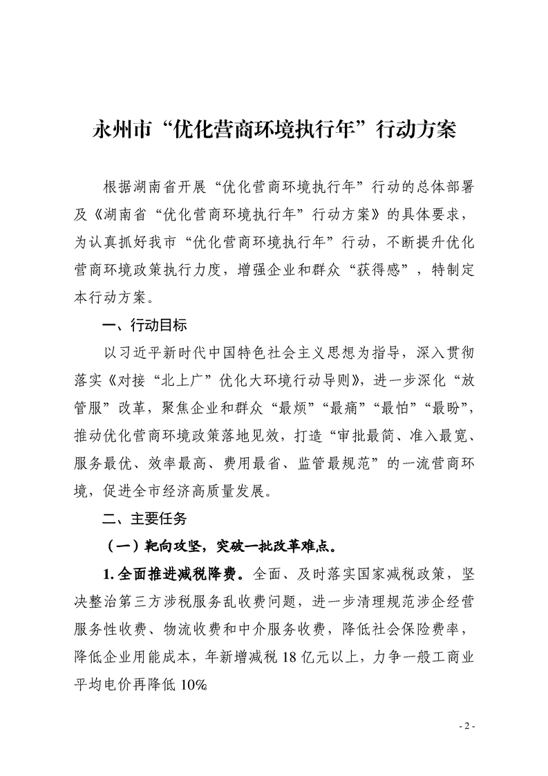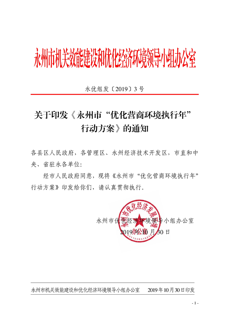 关于印发《永州市“优化营商环境执行年“行动方案》的通知