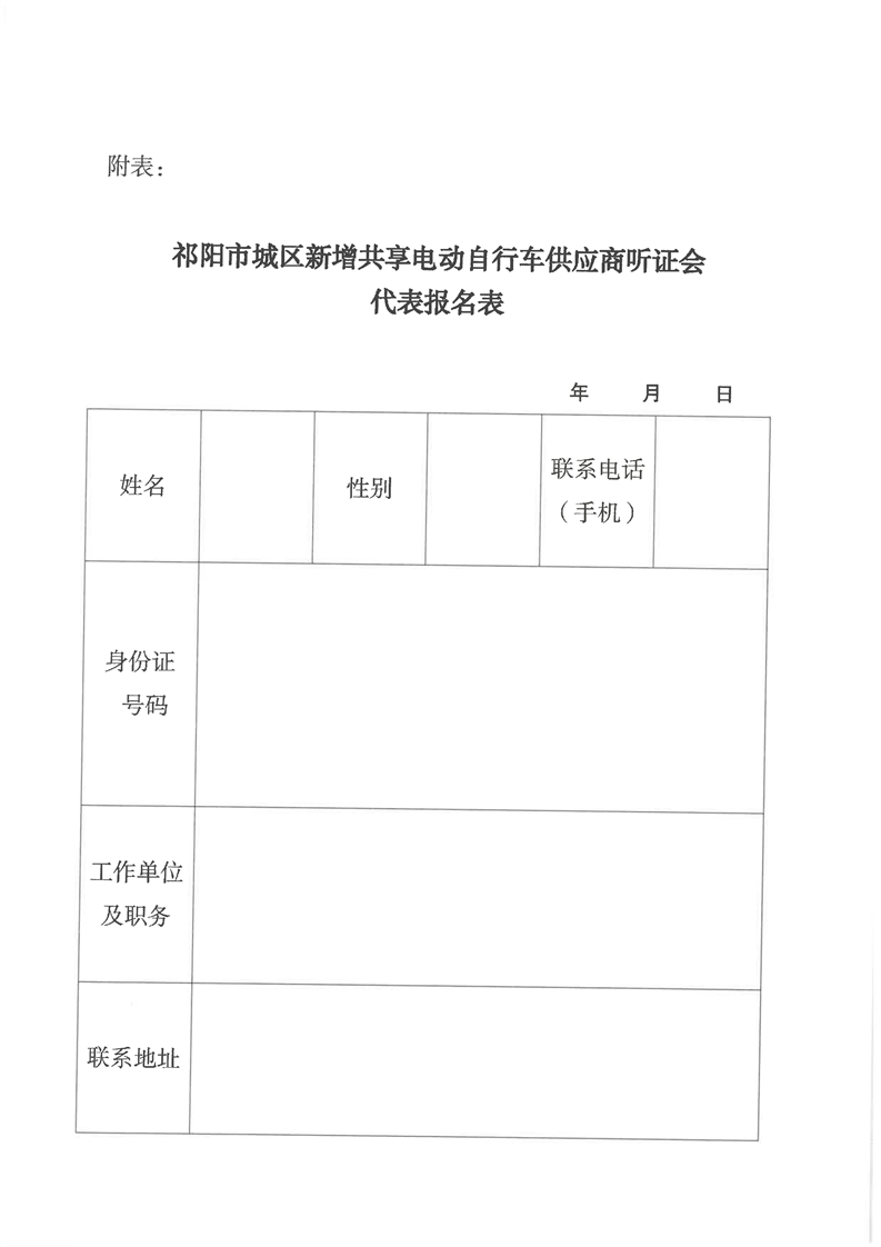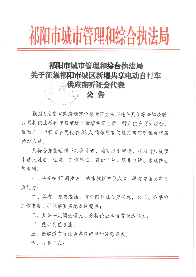 祁阳市城市管理和综合执法局关于征集祁阳市城区新增共享电动自行车供应商听证会代表公告