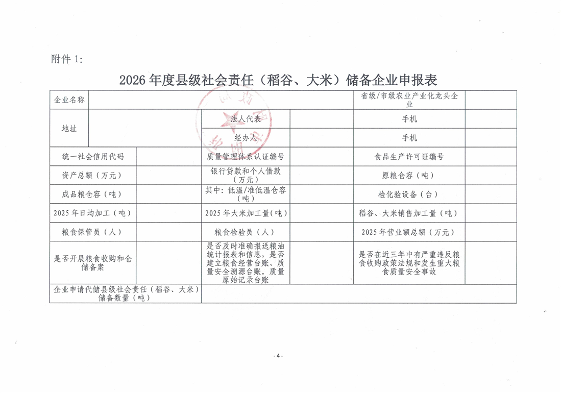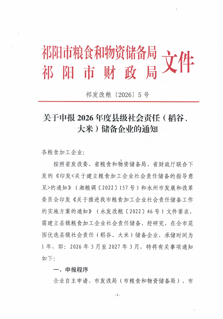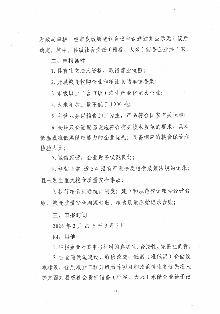 关于申报2026年度县级社会责任(稻谷、大米)储备企业的通知