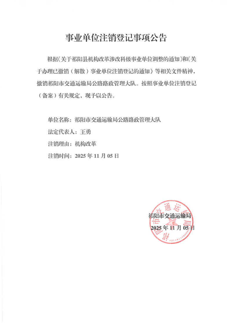 事业单位注销登记事项公告(祁阳市交通运输局公路路政管理大队)