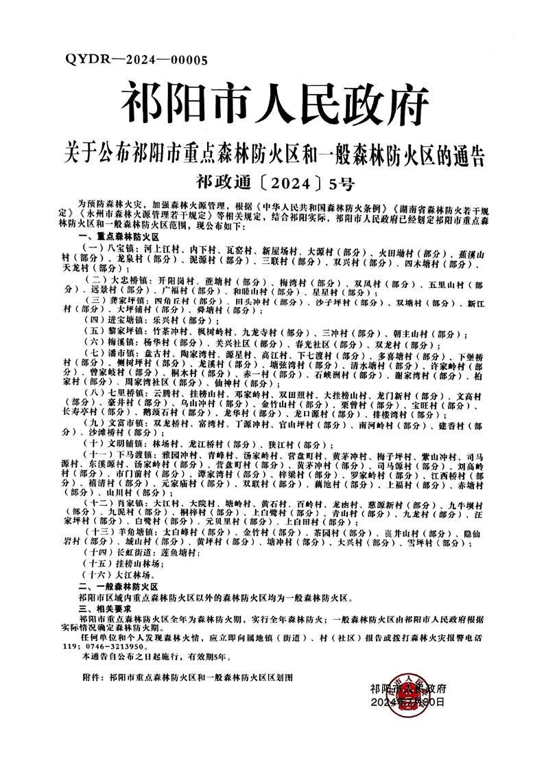 关于公布祁阳市重点森林防火区和一般森林防火区的通告